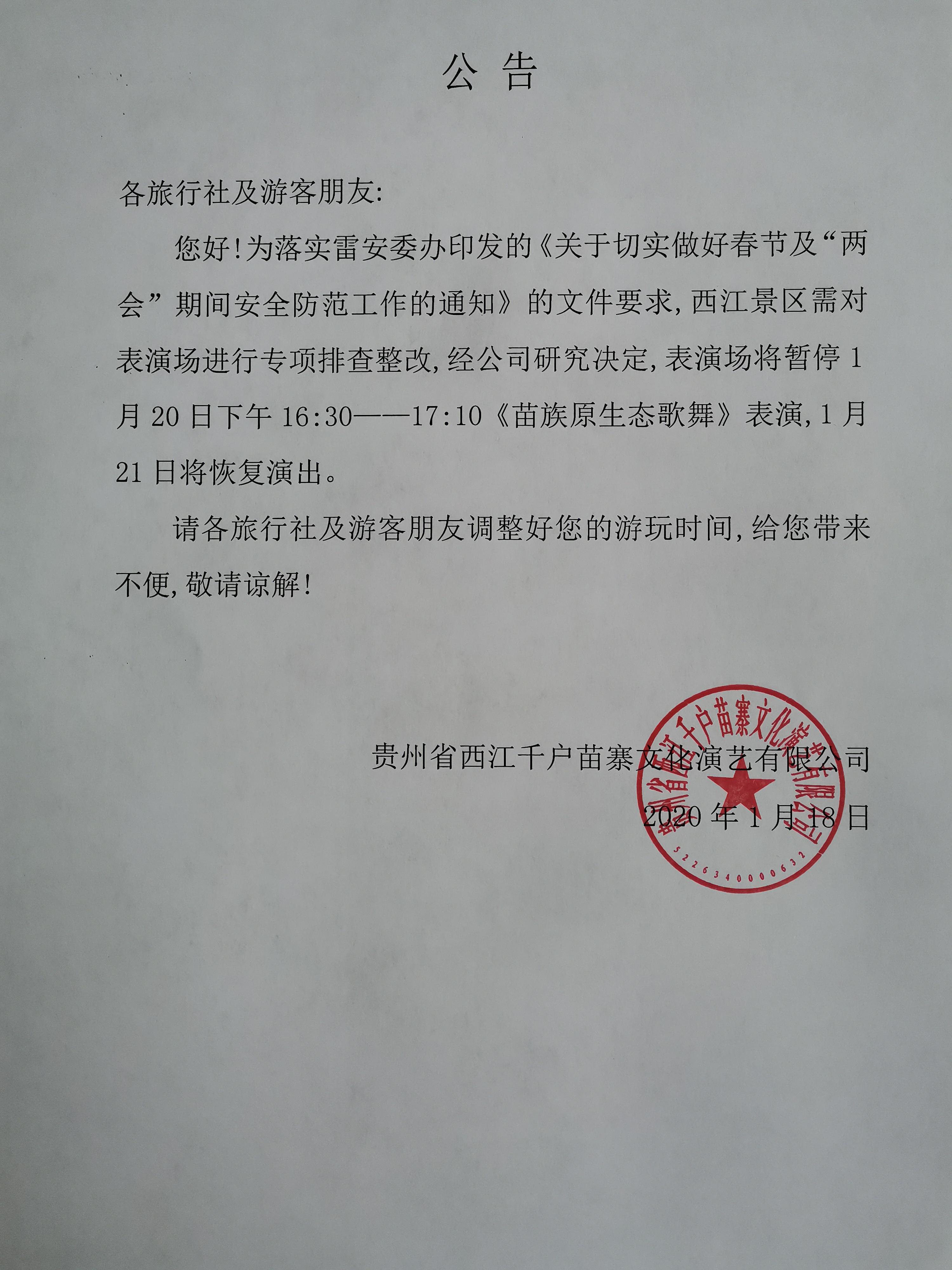 为落实雷安委办印发的《关于切实做好春节及“两会”期间安全范工作的通知》的文件要求,西江景区需对表演场进行专项排查整改,经公司研究决定,表演场将暂停1月20日下午