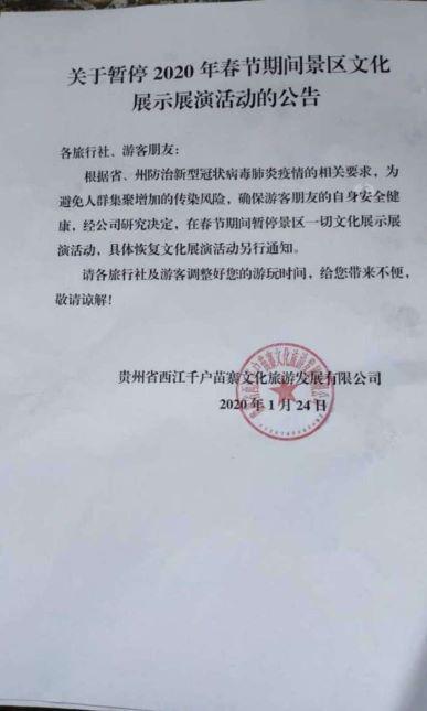 各位旅行社、游客朋友: 根据省、州防治新型冠状病毒肺炎疫情的相关要求,为避免人群聚集增加的传染风险,确保游客朋友的自身安全健康,经公司研究决定,在春节期间暂停景区一切文化展示展演互动,具体恢复文化展演活动另行通知