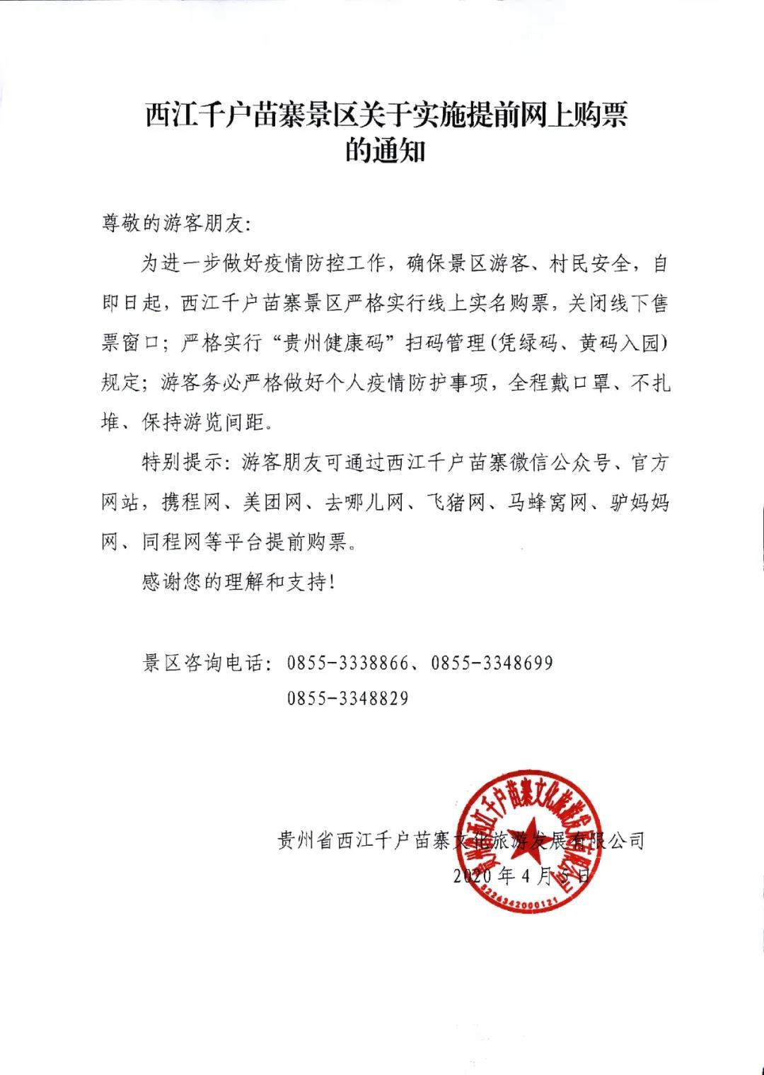 西江千户苗寨景区关于实施提前网上购票的通知