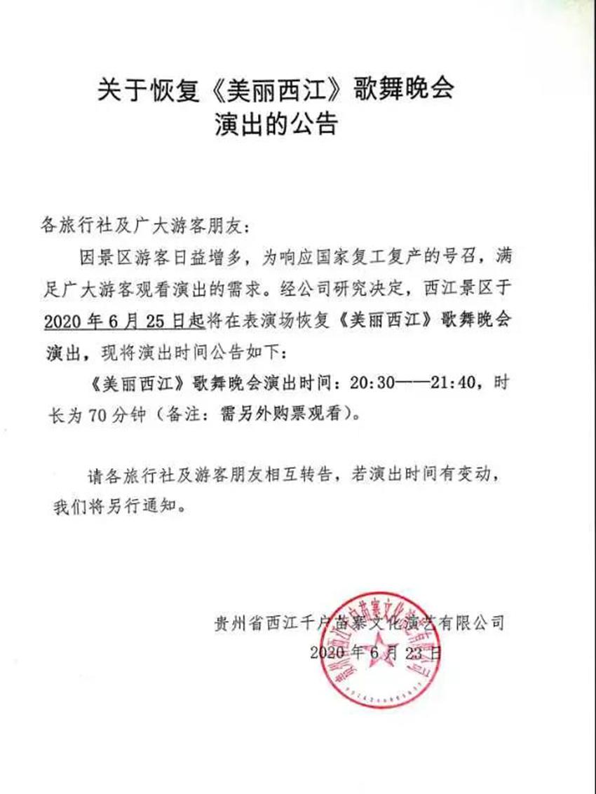 关于恢复《美丽西江》歌舞晚会演出的公告