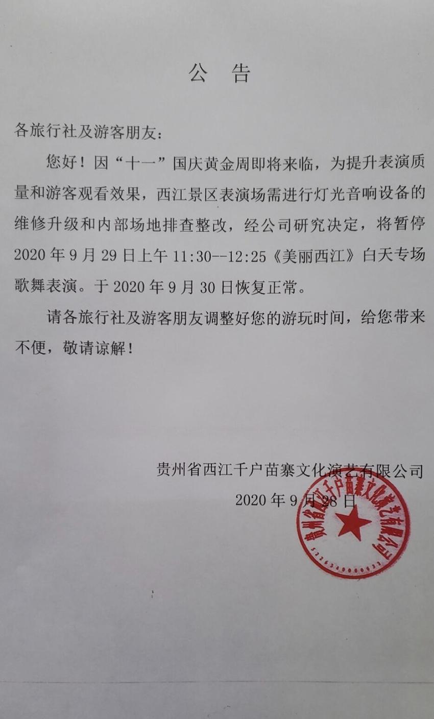 您好!因“十一”国庆黄金周即将来临,为提升表演质量和游客观看效果,西江景区表演场需进行灯光音响设备的维修升级和内部场地排查整改,经公司研究决定,将暂停2020年9月29日上午11:30-12:25《美丽西江》白天专场歌舞表演。于2020年9月30日恢复正常。