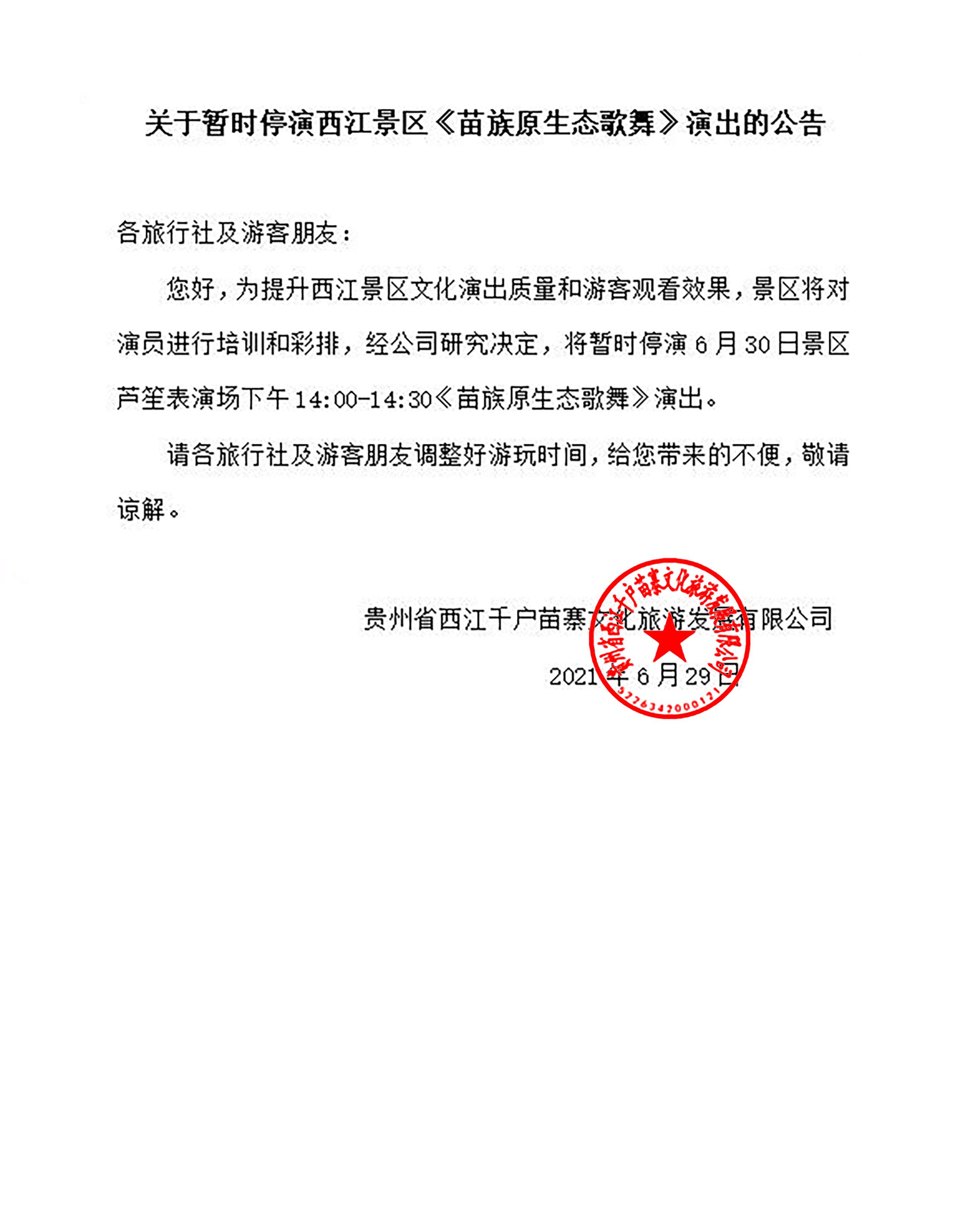 您好,为提升西江景区文化演出质量和游客观看效果,景区将对演员进行培训和彩排,经公司研究决定,将暂时停演6月30日景区芦笙表演场下午14:00-14:30《苗族原生态歌舞》演出。