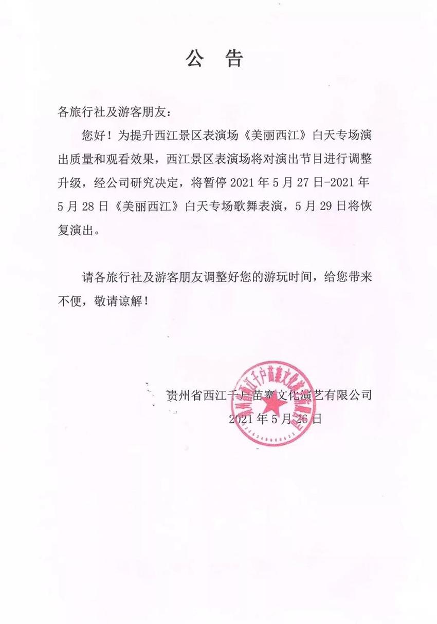 西江景区将于2021年5月27日-2021年5月28日,暂停《美丽西江》白天专场歌舞表演,于5月29日正式恢复,具体公告如下: