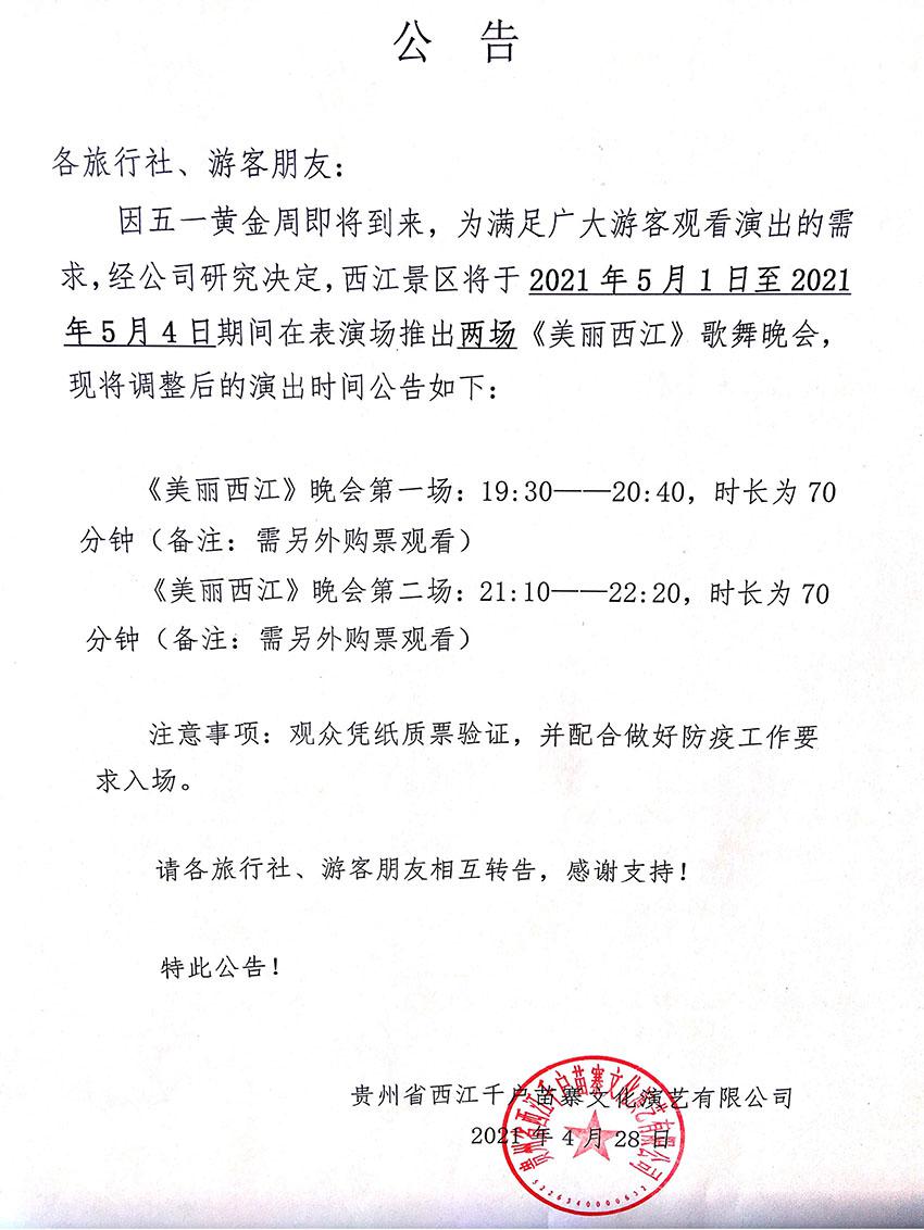 五一期间景区《美丽西江》歌舞晚会增加场次通知