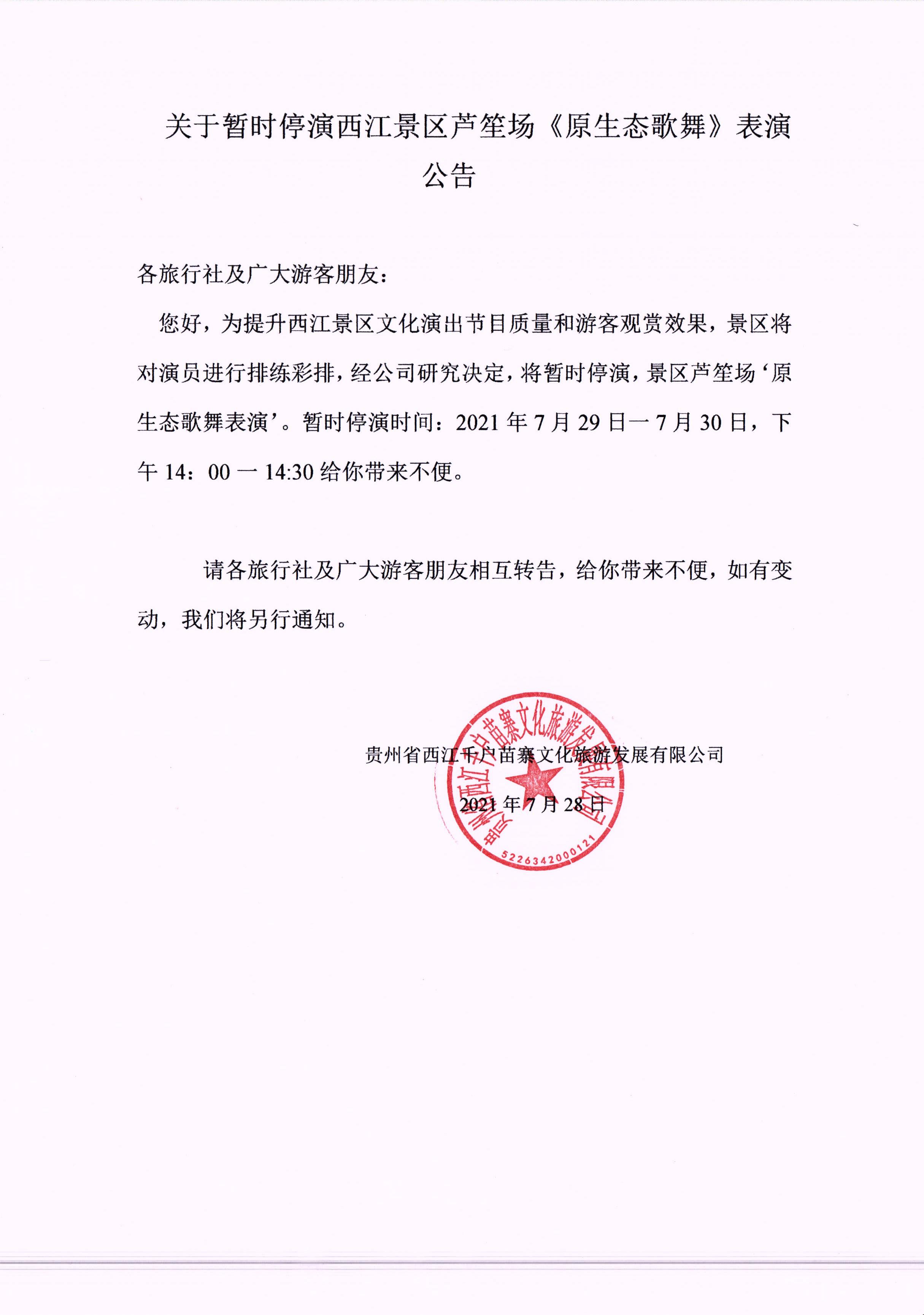 您好,为提升西江景区文化演出质量和游客观看效果,景区将对演员进行培训和彩排,经公司研究决定,将暂时停演6月30日景区芦笙表演场下午14:00-14:30《苗族原生态歌舞》演出。