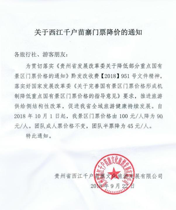 关于西江千户苗寨门票降价的通知