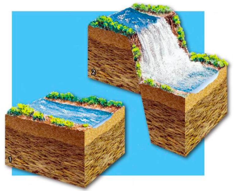 2. 地壳运动会造成断层或裂谷,两侧河床因为位置的变动产生落差,逐渐形成瀑布。如果发生多次断层的情况,还可造成多级瀑布。