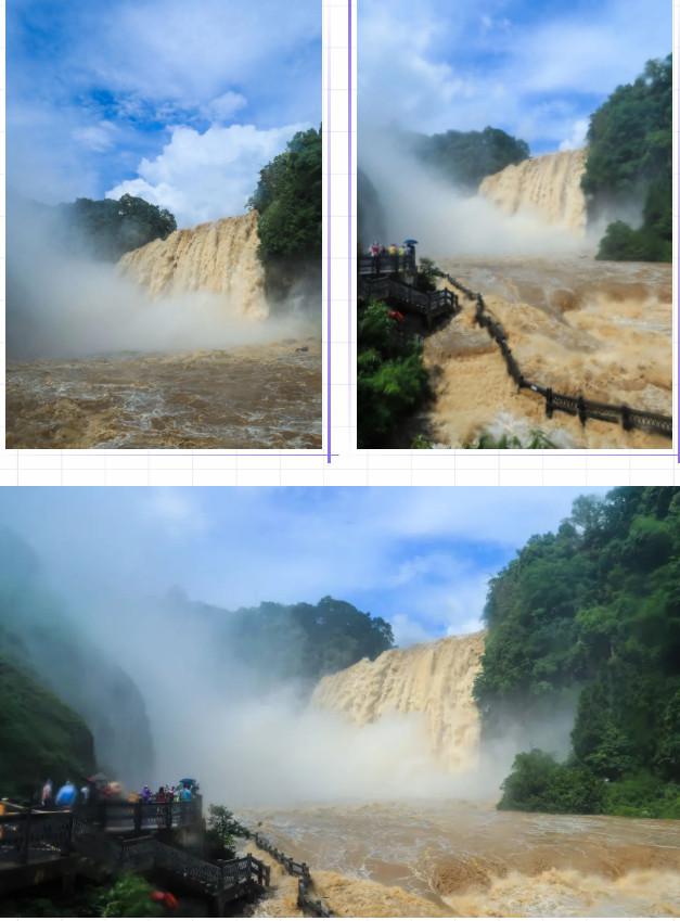 以往大多数时间里,瀑布都是清澈纯净的白色。但今年涨水后,水流呈现赭石一般的黄色,正如所有人能看到的样子,现在是名副其实的黄果树瀑布了。