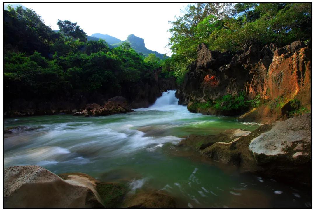 一条凡化河,穿过坝陵河峡谷,从大树跨岩瀑布再往下就是绿媚潭瀑布,高50米,宽10余米。悬空挂在山谷之中,站在开阔的山坡上,绿媚谭瀑布尽收眼底。