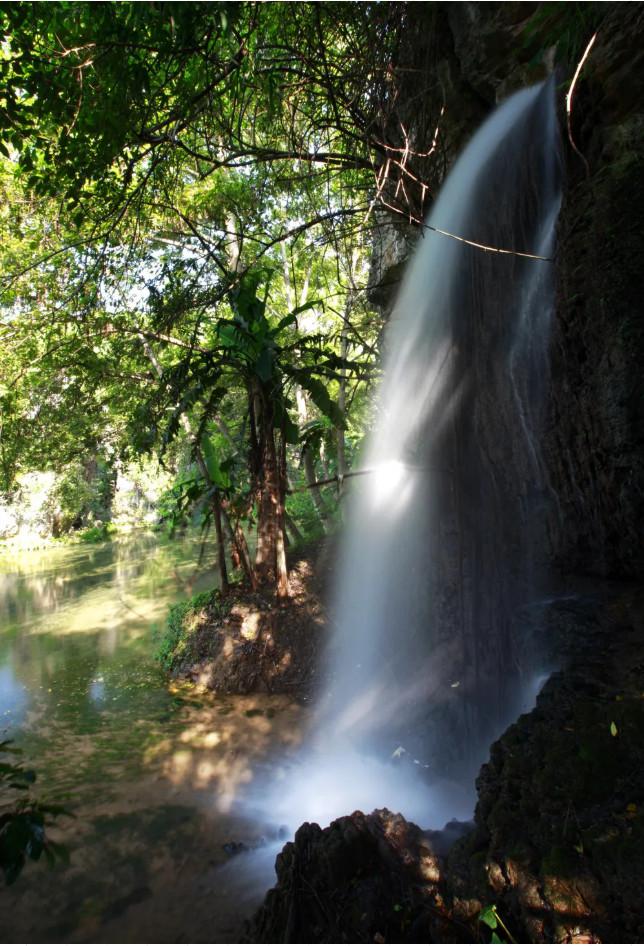 在一颗巨树之下,地下河从峡谷裂隙中涌出,形成一弯曲溶潭,这就是“落叶龙潭”瀑布。
