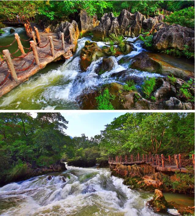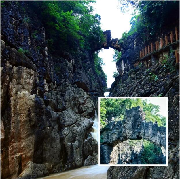 在天星桥景区里,有一处最令人拍案称奇的景观,那便是“桥上桥上桥”。为什么叫桥上桥上桥呢?连说三个“桥”的缘由是当地有一俗语“过桥不见桥。”