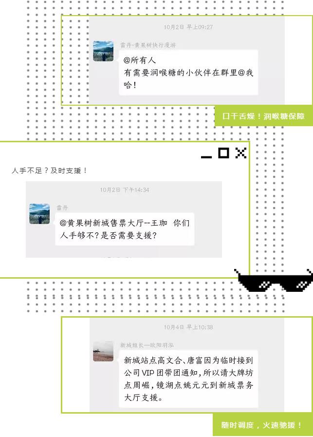 除了承担网上的诸多咨询,快行漫游倾团队之力,火速驰援到景区其他咨询点,与集团一心做好黄金周的志愿者服务。