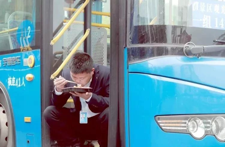 趁轮岗时间蹲在车门口吃饭的司机师傅