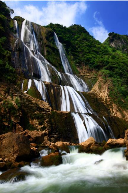 滴水滩瀑布位于黄果树瀑布以西6公里,关岭县境内,瀑布总高410米,为黄果树瀑布的六倍。站在大坡顶遥望整个瀑布,瀑布就仿若身着白色衣裙的天仙,仪态万方的从万顷冷绿之中露出她的身姿。