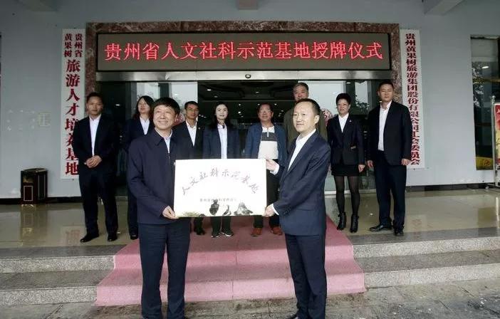 座谈结束后,包御琨书记将“人文社科示范基地”牌匾亲自授予吴声洪董事长。标志着省级“人文社科示范基地”正式落户贵州黄果树旅游集团股份有限公司。