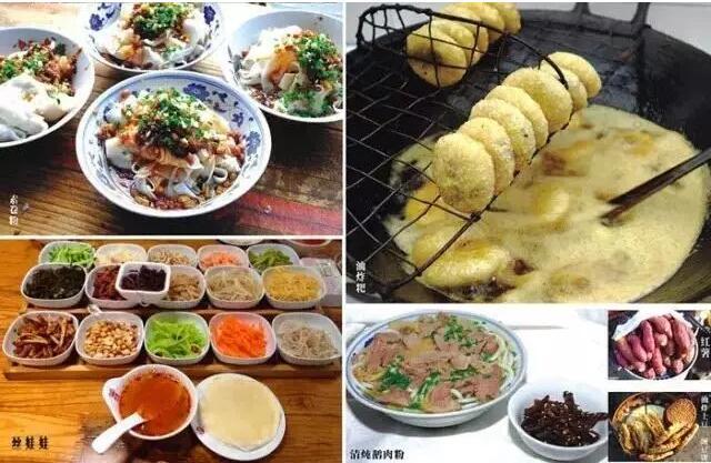 贵州素有“玩在贵阳,吃在安顺”的说法,足以见得安顺小吃的美味与名气。安顺美食有别于川菜、粤菜等菜系,风味独特,突出了黔地特有的酸味,火锅也自成特色。安顺的美食集中在小十字街、顾府街附近。主要包括:花江狗肉、丝娃娃、荞凉粉、素剪粉、干鸡块粉面、松糕卜粉、伍仁冲冲糕、裹卷、破酥包子、豆腐圆子、小锅凉粉、油炸粑稀饭、油炸鸡蛋糕、白糖饺、水晶凉粉等特色风味小吃。夺夺粉”是一种类似火锅又完全不同于火锅的贵州安顺小吃,锅底由店家调配当地风味,酸辣鲜香,非常美味。