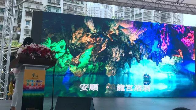 10月14日下午,由贵州省旅游发展委员会、澳门旅行社协会主办的“澳门万人游贵州”活动在澳门黑沙环公园启动。安顺市内各大景区参会推介,安顺市旅游发展委员会副主任罗定山与与会领导、嘉宾一起为启动仪式剪彩并与到场澳门市民互动。