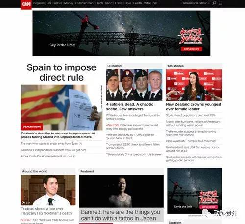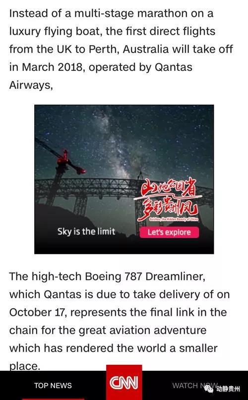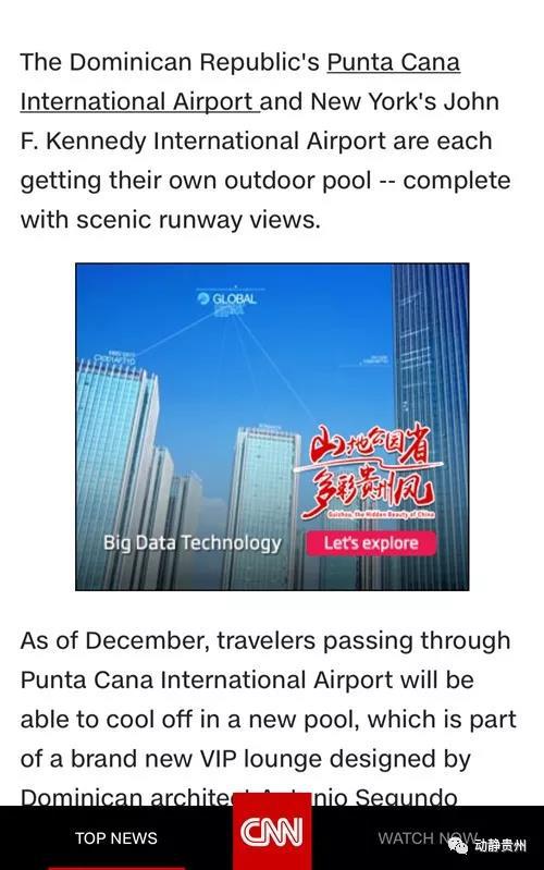 近日,贵州又霸屏CNN ! 怎么个霸屏法?来,带你去瞧一瞧! 瞧,CNN(美国广播电视新闻网)数字平台、电视平台和全美机场电视终端,广告位通通被贵州形象宣传片占据! 再来瞧瞧!在CNN的网站首页,移动端APP的教育、体育、旅游、金融、科技等各大版块,随处可见“山地公园省,多彩贵州风”的形象宣传片。厉不厉害!霸不霸气! 歪果人继去年美国大选期间被铺天盖地的贵州形象宣传片惊到以后,这次,咱们贵州秀丽的自然风光,丰富多彩的少数民族风情,再次惊艳了世界。贵州有多惊艳?请戳视频! ▼▼▼