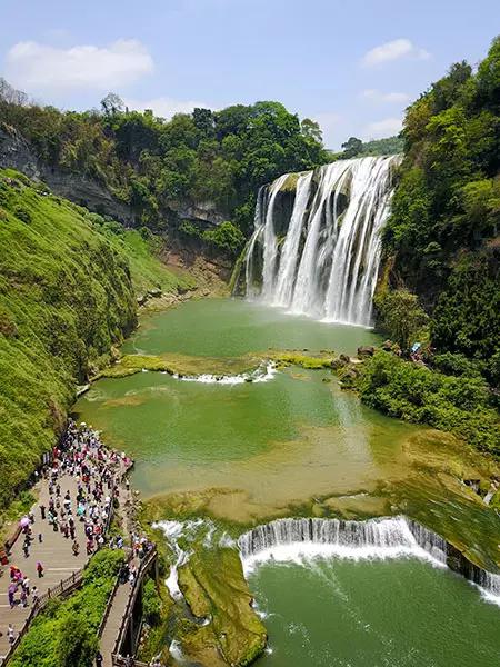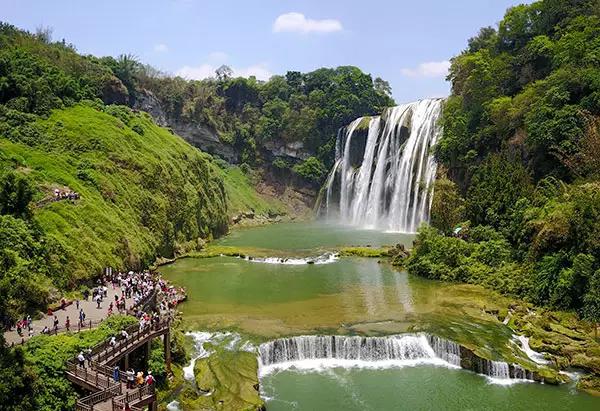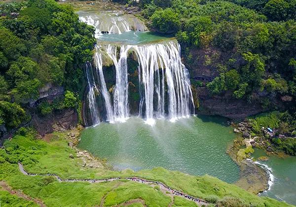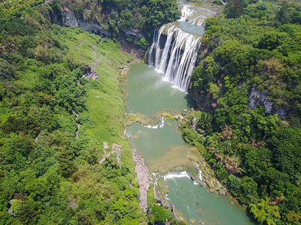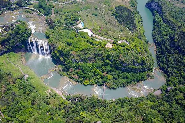 夏日时节,位于贵州安顺境内的黄果树瀑布景区绿意盎然,从空中俯瞰,瀑布气势磅礴,蔚为壮观。