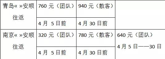 据山东航空股份有限公司南京营业部总经理雷莹先生介绍,该航线班期为每周一、三、四、六,每周执飞4班,航班号:SC4943:13:35青岛起飞,14:55抵达南京;15:55南京起飞,18:30抵达安顺。航班号:SC4944:19:15安顺起飞,21:25抵达南京;22:25南京起飞,23:45到达青岛。为让利两地游客,开航初期推出了较大幅度优惠政策:青岛—安顺团队往返价格为全价的2折(往返760元)、南京—安顺团队往返价格为全价的1折(往返320元)起(注:团队1折优惠时间为4月5日前,4月5日-4月30日团队往返优惠价格为640元)。自由行旅客,青岛—安顺往返价格也将享受全价2.5折(往返940元)、南京—安顺享受全价2.5折(往返780元)的优惠(注:散客优惠时间为4月30日前)。
