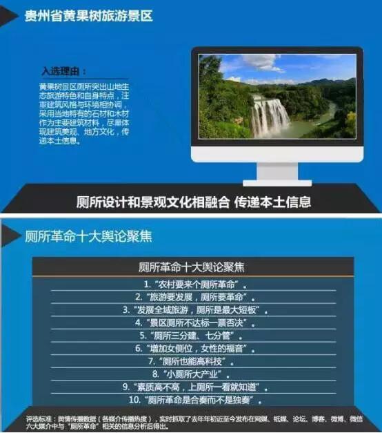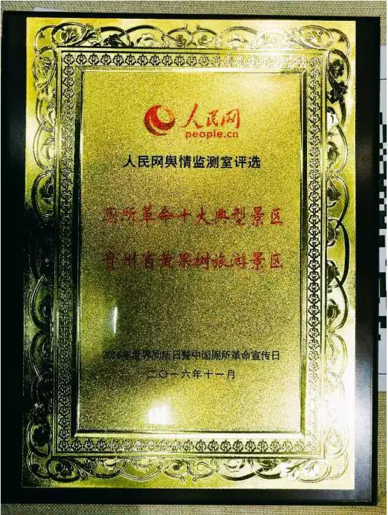 活动现场,人民网发布了《厕所革命十大评选榜单》,公布“厕所革命十大典型景区”“厕所革命十大推进人物”“厕所革命十大舆论聚焦”三项内容,并对典型景区与推进人物进行了颁奖。黄果树景区在列厕所革命“十大典型景区”。