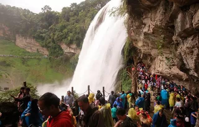 ——在大瀑布景区水帘洞出口处,游客穿着雨衣、撑着雨伞,仍被洞中的瀑水淋了不少,不过神奇的水帘洞还是满足了大家的好奇心,没有因为降雨而打折扣。