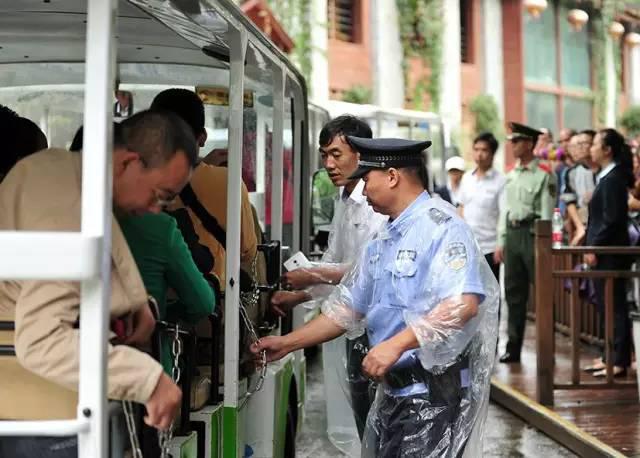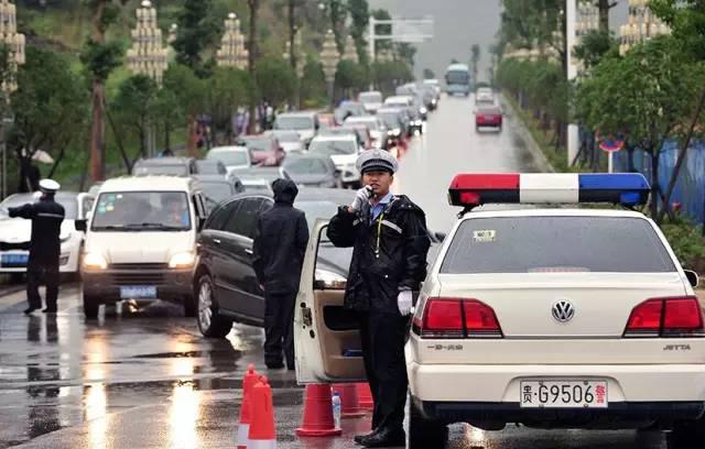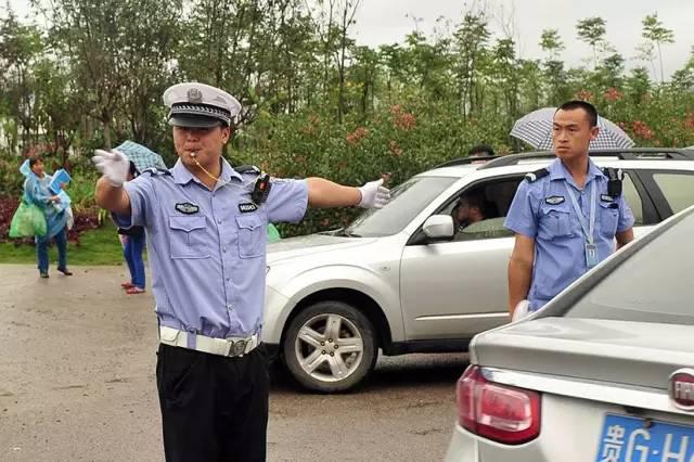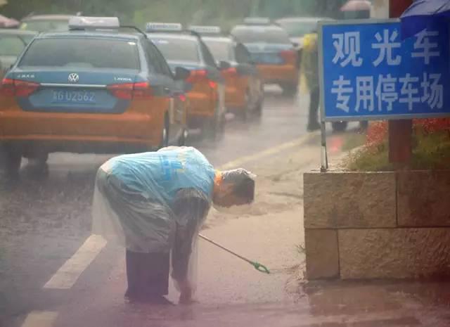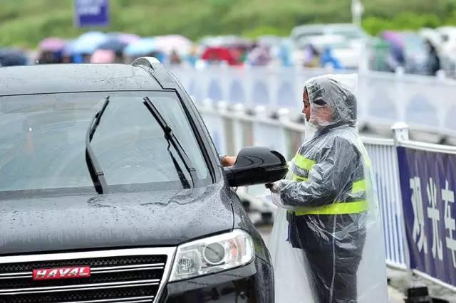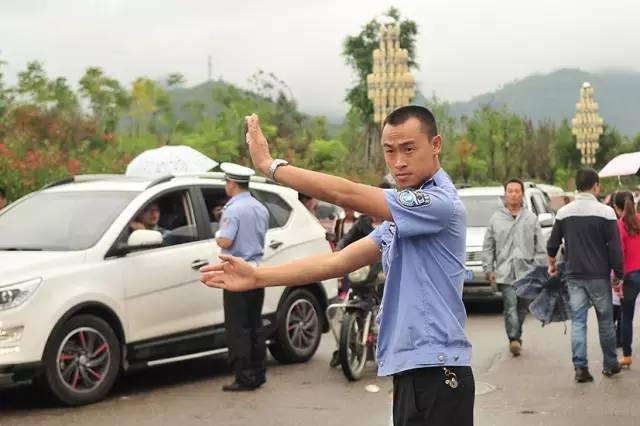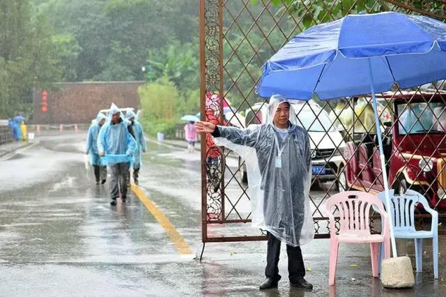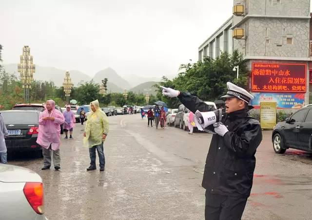 “穿雨衣不方便工作”,正在陡坡塘路段指挥交通的交警对同事递来的雨衣这样回答。雨中,源源不断的观光大巴车和游客在他的指挥下得到有效梳理。