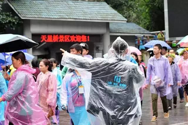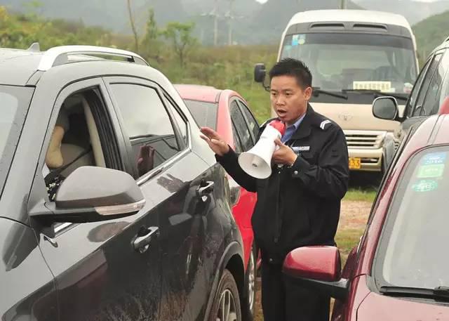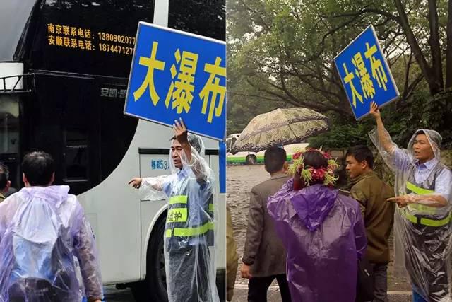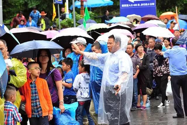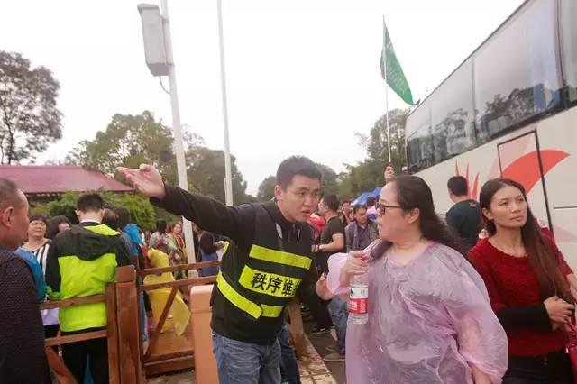 “靠边站,排好队”,在天星桥景区维持秩序的汪剑勋正和同事,一边用大喇叭喊着指引游客乘车入园,一边解答游客提出的问题,由于没穿雨衣,工作服淋湿好几次。