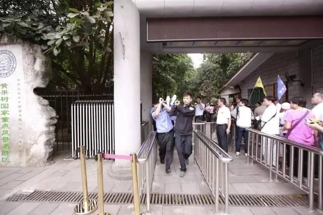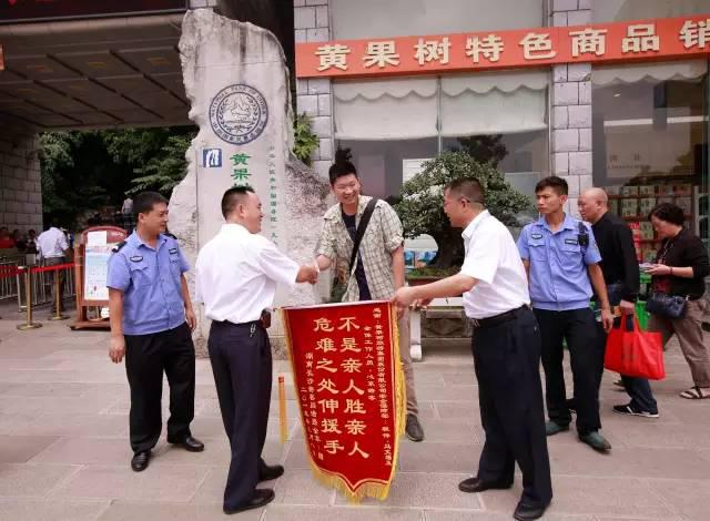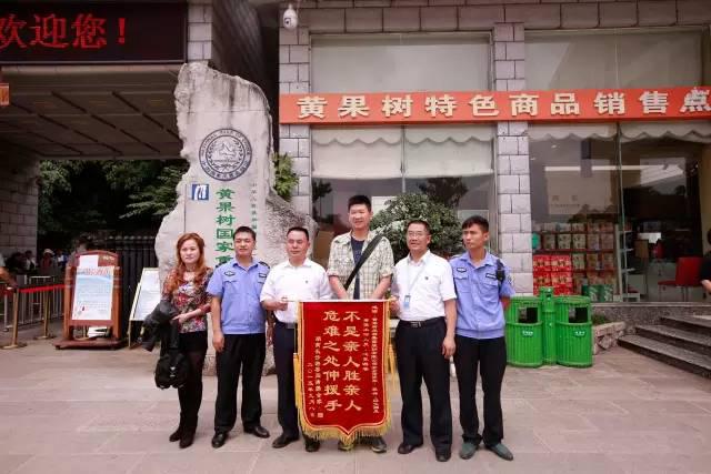 黄果树景区工作人员与阎先生在大瀑布景区入口处合影