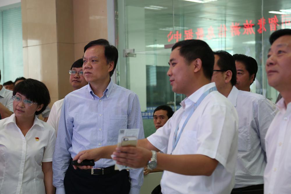 上午11:00,陈敏尔省长首先来到黄果树旅游集团股份有限公司,黄果树旅游集团公司董事长冷朝阳、总经理周云虹和董事长助理张目分别向陈敏尔省长汇报了黄果树景区打造升级版和智慧旅游建设的情况。黄果树智慧旅游建设严格按照“一个中心、两个平台、十八个应用端”统一规划、分三个阶段进行实施,目前已经完成了一期建设,二期建设正在进行中。当陈敏尔省长来到黄果树智慧旅游数据信息中心的时候,黄果树旅游集团总经理周云虹和董事长助理张目向陈敏尔省长展示黄果树景区智慧旅游的“车辆自动分析系统、免费wifi、线上线下一体化、智能可视系统、云门禁系统、景区容量实时控制系统、黄果树电商平台(快行慢游网)”等。