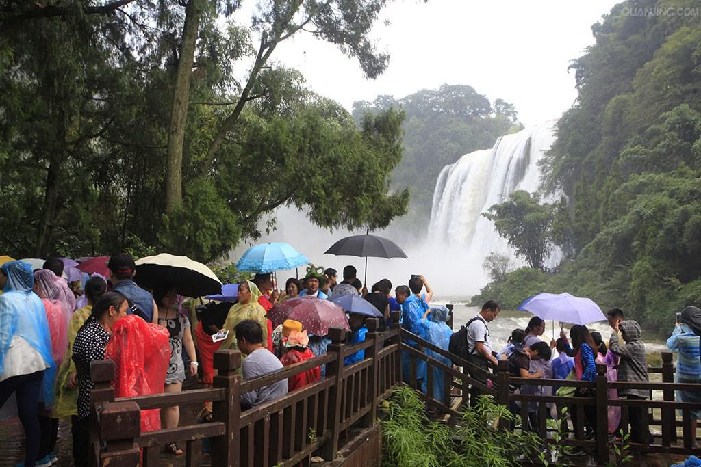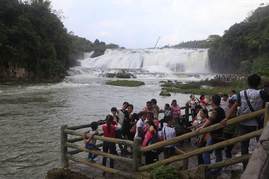 游客凭栏驻足观瀑