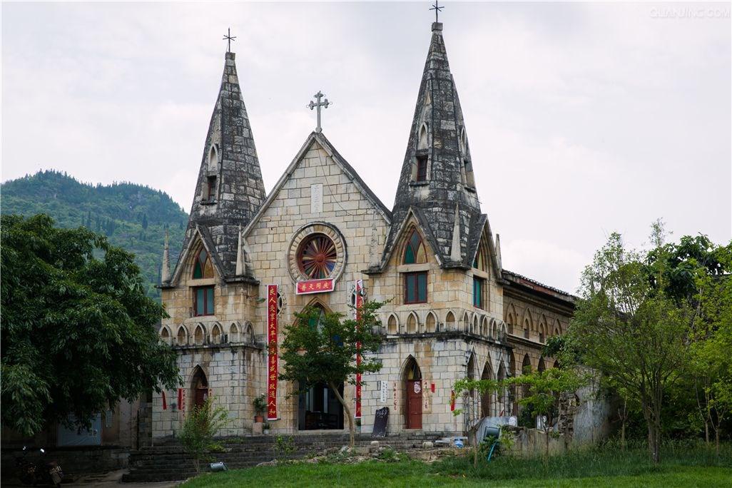 不久,来到一个约500多平方米的观景台,在这里可将大瀑布尽收眼底。身后,一座“哥特式”石砌尖顶小教堂与大瀑布遥相对望。这座建成于清朝光绪二十四年(1898年),由尹姓族人捐资、法国传教士司方济各主持兴建的教堂,已有一百一十多年的历史,是黄果树景区内唯一的宗教标志性建筑,抗战时期曾是美军运输队在此作礼拜的主要教堂。身处这两者之间,突感山水的奇异与历史的沧桑交融,无形间为游览增添了一份人文的厚重。