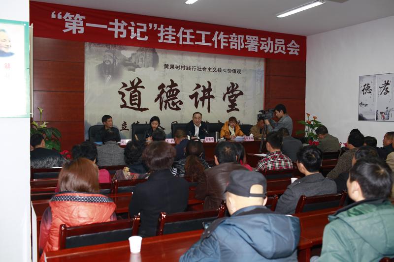 在深入开展党的群众路线教育实践活动中,为切实推进“第一书记”挂帮工作取得实效。2014年3月17日晚上19:30分,在黄果树村二楼会议室召开了“第一书记”挂帮工作部署动员会暨道德讲堂开讲会。黄果树村党总支书记吴家谷主持会议并作讲话;黄果树党工委副书记、旅游集团公司董事长、黄果树村“第一书记”吴晏明作动员讲话;会议研究讨论了《黄果树村村规民约》、“五好家庭”评选活动方案等。黄管委组织人事部、集团公司党的群众路线教育活动办等有关领导出席会议,黄果树村支两委班子成员、村民代表、党员共50余人参加此次会议。