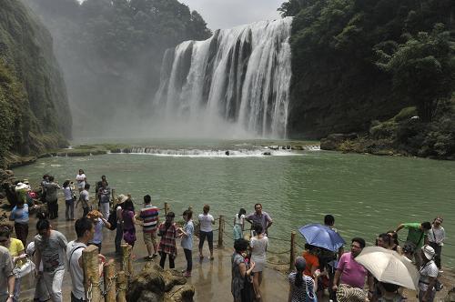 6月19日,游客在黄果树瀑布前游玩。端午过后,贵州黄果树瀑布进入丰水期。6月19日,黄果树瀑布水流量达每秒80立方米,已进入丰水期和旅游高峰期。