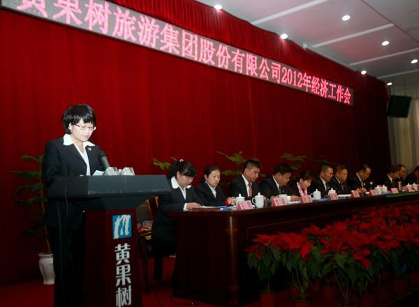 会议首先播放了“2012年黄果树旅游集团股份有限公司大事记”幻灯片,展示了在过去的一年里,公司在工作中所取得的成绩和进步。接着,集团公司总经理周云虹女士作了《黄果树旅游集团股份有限公司2012年经济运行情况及2013年生产经营计划报告》,针对集团公司2012年游人及经济效益、职工薪酬及福利、项目建设、生产经营管理等各项生产经营工作所取得的成绩作了总结,并对存在的问题和不足进行了分析,最后,对2013年的生产经营工作作出了全面安排和部署。
