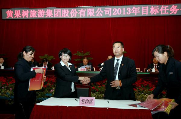 第二,会上,公司相关部门领导就黄果树战略定位、市场营销、项目建设、人力资源管理、绩效考核办法、财务收支计划等各项工作2012年完成情况向大会作了全面、客观汇报,并有针对性提出了2013年工作打算。会议现场,集团公司各分、子公司负责人与集团公司签订了“2013年目标任务书”,任务书的签订标志着集团公司2013年的工作启动冲锋号已经吹响。