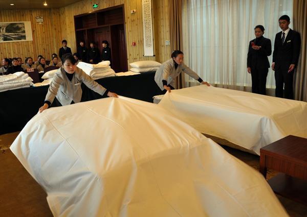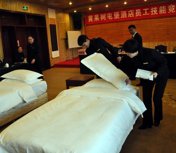 在酒店集团的精心策划及各部门的大力支持和配合下,2012年12月22日,酒店集团员工业务技能竞赛活动第一期——屯堡酒店客房部员工业务技能竞赛隆重举办并取得圆满成功。酒店集团、屯堡酒店领导及各部门负责人参加了活动。 本次竞赛以酒店员工行为规范测评及业务操作为主,客房部30余名服务人员参加了竞赛。 通过竞赛,加深了员工间业务技能的交流和学习,增强了团队凝聚力。因此,这不仅是一次成功的竞赛,更是一场酒店行为规范及业务技能的大培训。 据了解,继客房部之后,屯堡酒店餐饮部等也将相继开展员工业务技能竞赛活动。