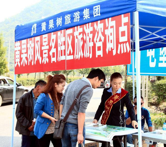 服务质量提升,为进一步的提高景区的服务质量,节日期间黄果树旅游集团公司增开售票窗口,并将团队与散客售票点分开,(散客购票点:黄果树票务中心,团队购票点:黄果树旅游集团公司一楼大厅)以缩短游客购票等待的时间,景区内设立工商、旅游游客投诉点,咨询服务点,微笑小屋等。景区还在高速公路出站口,为游客发放温馨提示卡(提示能告诉游客自己所在的位置、景区游览线路、与周边景区的距离与线路等)增值服务,黄金周期间乘座景区观光车的游客不管老少都能领到一瓶胶原蛋白饮料,这不仅体现了景区人性化的服务,更让游客得到了实实在在的实惠。