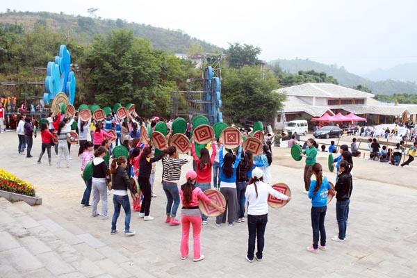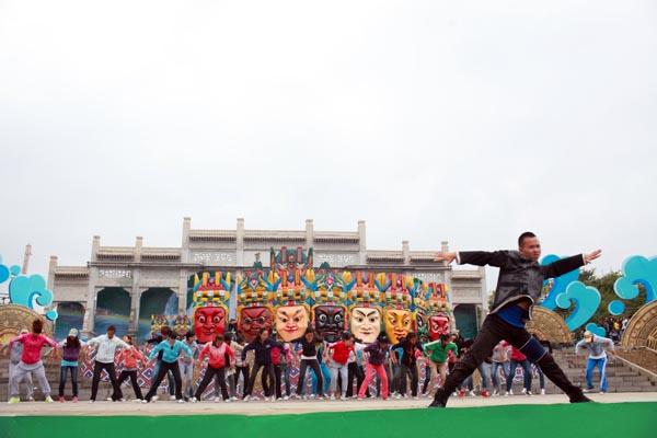 黄果树瀑布节唱山祭水活动演员顶着瀑布水雾排练