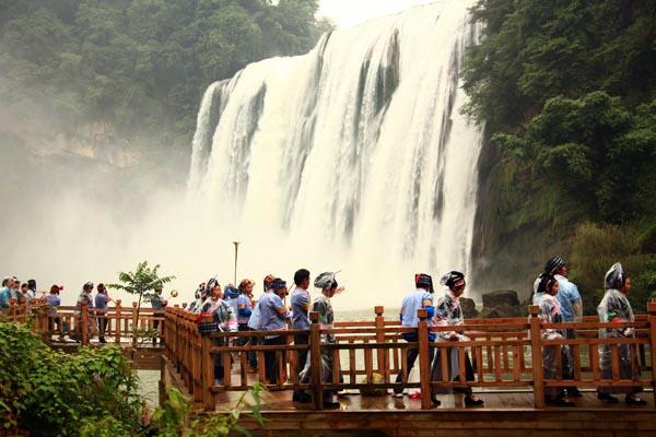 黄果树瀑布节唱山祭水活动演员顶着瀑布水雾排练 (1)