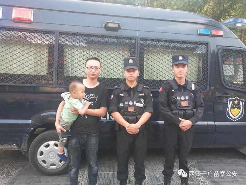 2019年10月3日,下午16时50分许,一名好心游客将一个哭哭啼啼2岁左右的小男孩交给正在西江景区执勤的特警,几名特警一边帮小男孩擦眼泪,一边用语言安慰小男孩,并立刻向指挥中心汇报丢失小孩情况,如有报警寻找丢失的小孩立即与他们联系。大约40余分钟后,正当小男孩的父亲急匆匆找到表演场外正在执勤的特警报警时,听到警车内传来熟悉的哭声,发现自己走失的孩子就在特警的怀里。