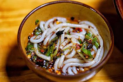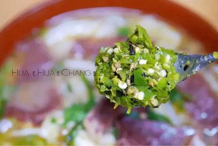 这家店已经开了8年了,也算的上是西江千户苗寨里的老店了。她家的辣椒是自家制的,吃粉前先喝一口酸汤,汤底是骨头汤,再加上微微偏辣的酸汤,刺激你的味觉,配上腊肉手工米皮或是米粉,肉沫、香肠、鹌鹑蛋,满满的一碗,是清晨的幸福。