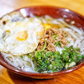 和「周妹小吃店」相比,汤更浓郁些,店主是本地人,说这里的牛肉粉主要靠芫荽提味,芫荽量多新鲜是判断好坏的标准之一。她家还提供了烧青椒,鲜辣的口感再搭配上浓郁的米粉,口感十足。