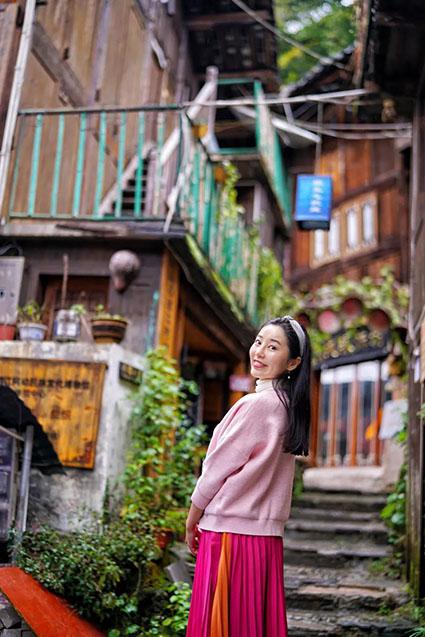 沿着苗寨石阶往上攀爬,空气爽朗,一路上随处可见的苗家木吊脚楼建筑是这座苗寨藏不住的底蕴和不经意的傲娇,放慢步伐,细细欣赏它的美。