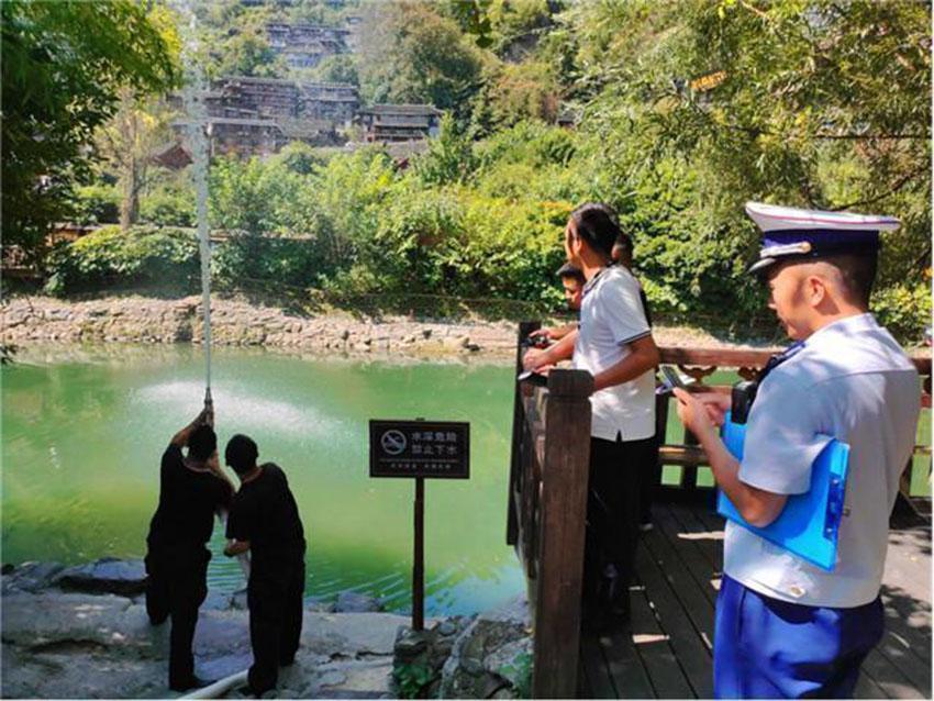 首先,针对西江苗寨各区域进行消防安全检查,主要对办公室区域、基础设施、表演场、各项消防设施等进行排查,重点针对各个区域消防安全布局是否合理,防火间距是否符合消防安全技术规范的要求,消防水源是否充足,消防车道是否畅通,消防安全责任制度是否落实,生产、经营和储存的操作流程是否符合消防安全规定,重点工种操作人员是否能够熟练操作灭火器材,有无醒目的消防安全标语、警语等情况进行了详细的检查。