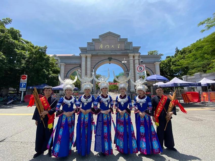 会场之外,苗家姑娘小伙身着盛装,在厦门大学、世贸海峡大厦、白城沙滩等地留下了美丽的足迹,较高的气温难挡来自黔东南的热情,路遇市民不断拿出手机拍照留影。