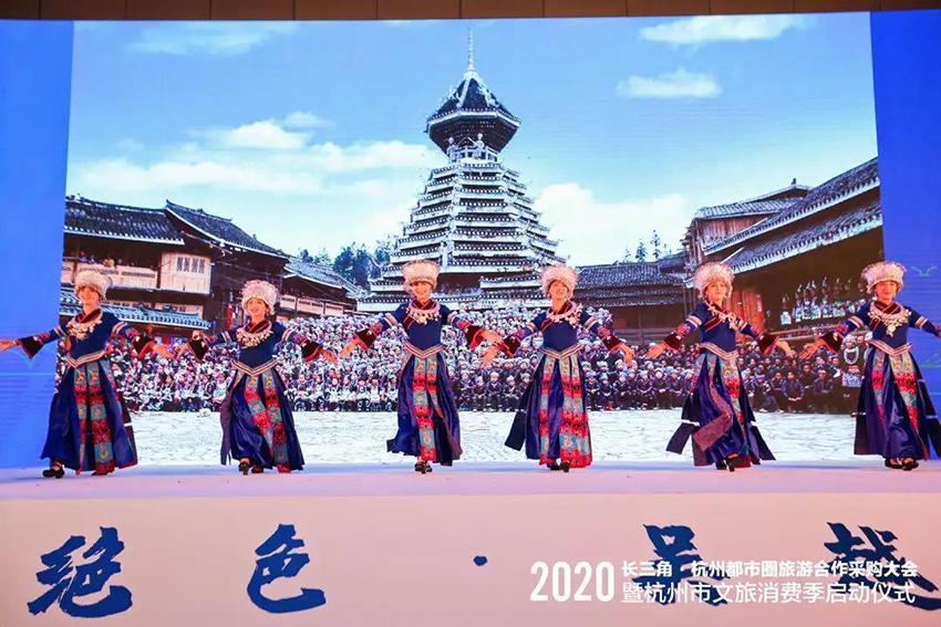 杭州市是黔东南苗族侗族自治州的对口帮扶城市,得益沪昆高铁的便捷,此次活动杭城将黔东南也拉进了长三角文旅事业共同发展的重要圈子。来自西江千户苗寨景区的苗家姑娘为大会表演了开场舞,苗家踩鼓舞为会议召开带动了热烈的气氛。