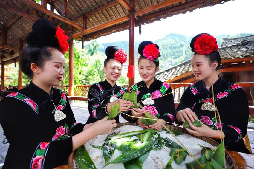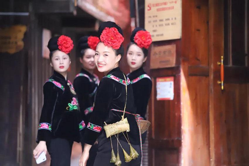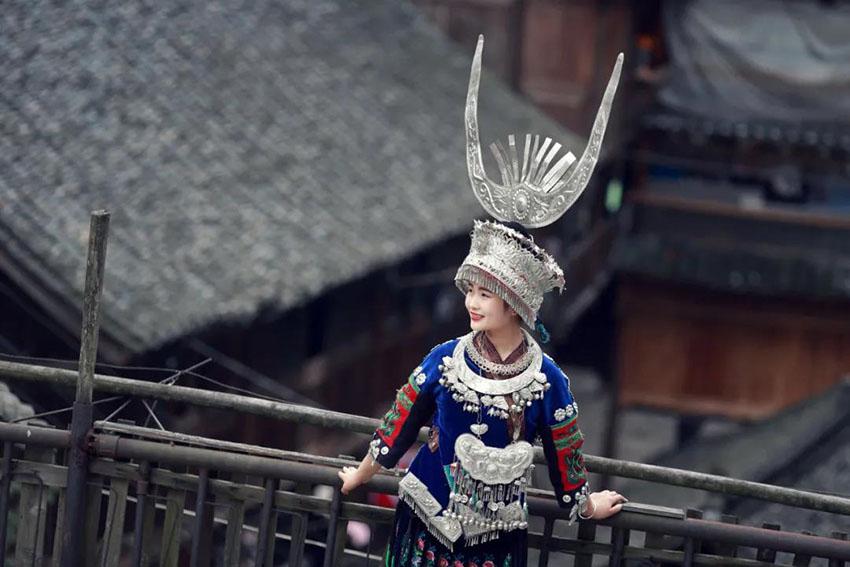 每到逢年过节或有重大活动,人们都会在西江苗寨看到身着盛装的苗族姑娘,她们穿着亮丽的苗族服饰,头戴大银翅,一身银光闪闪,绚丽动人,走起路来,银饰盛装发出唰唰唰的声响。“聚会时时精美的银河,跳舞时是壮观的银海”。