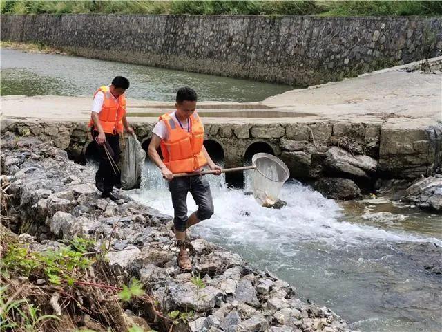 水库管理员王锦和同事进行水库河道巡查水域垃圾清理