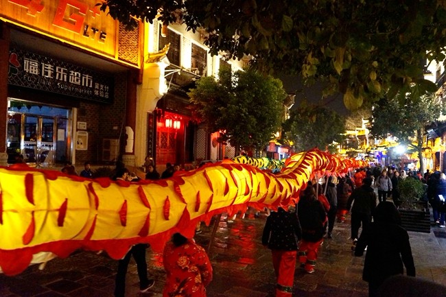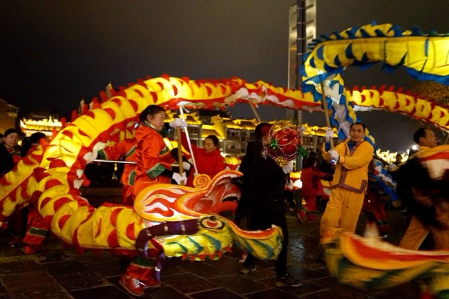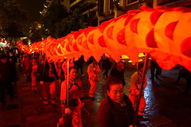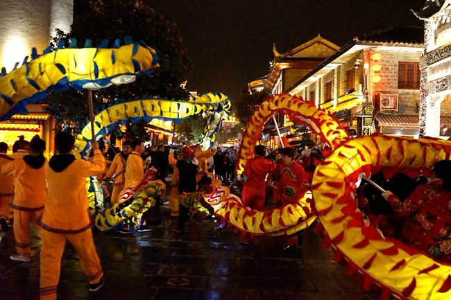 2月9日(农历大年初五)晚上8时,镇远古城热热闹闹、一片祥瑞。新中社区的两条龙随着鼓点在社区群众的舞动下活灵活现,引来不少市民和游客的围观。有的大人为了讨个好彩头,抱着自己的小孩穿梭其间。现场锣鼓声、欢笑声、喝彩声不绝于耳。